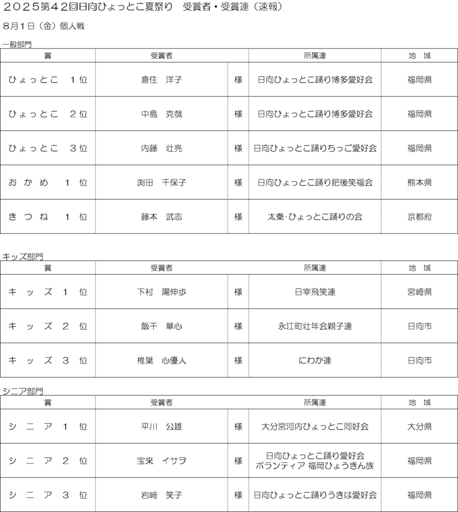 2025年08月01日 2025第42回日向ひょっとこ夏祭り個人戦結果(速報) 2025年8月1日(金)に開催されました第42回日向ひょっとこ夏祭り個人戦の結果速報をお知らせいたします。 個人戦受賞者一覧→【PDF】