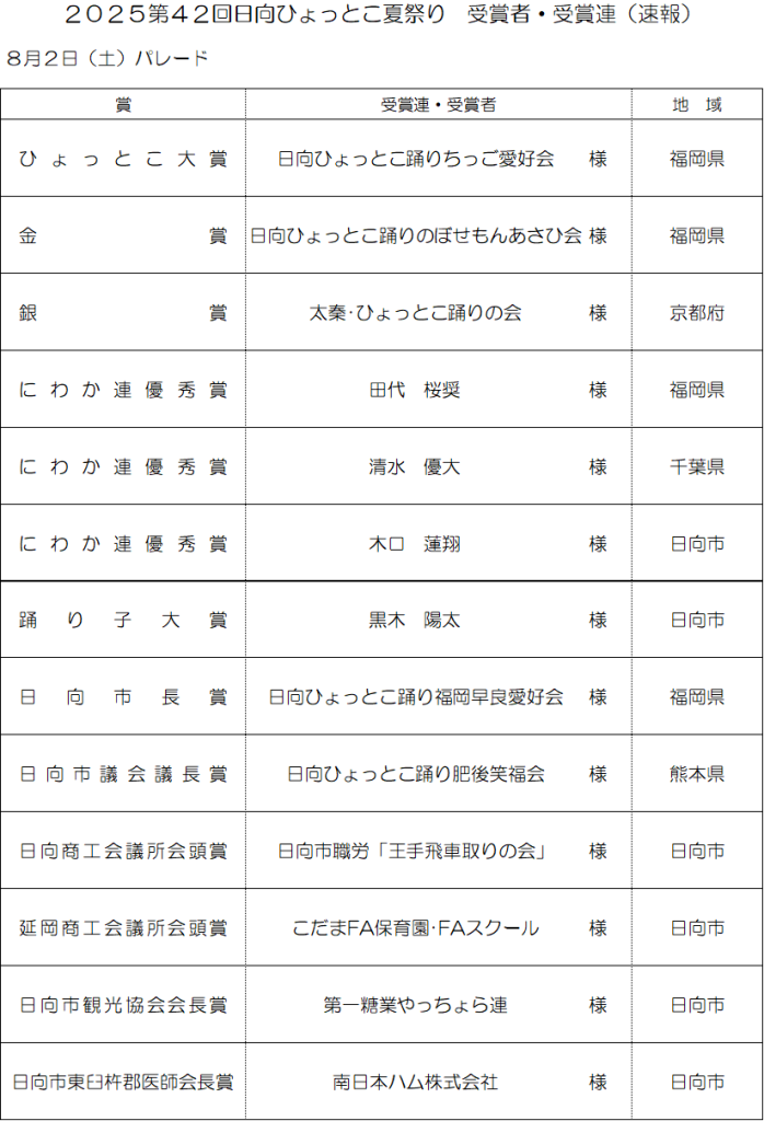 2025年08月02日 2025第42回日向ひょっとこ夏祭りパレード結果(速報) 2025年8月2日(土)に開催されました第42回日向ひょっとこ夏祭りパレードの結果速報をお知らせいたします。 受賞された皆様おめでとうございます!踊り手の皆様、また来年パレードでお会いしましょう! 第42回パレード結果 → 【PDF】