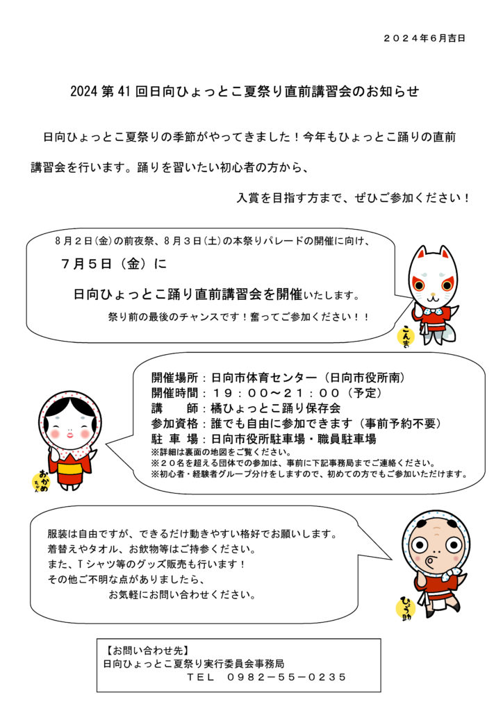 この講習会は、日向ひょっとこ夏祭りを直前に控えてひょっとこ踊りのスキルアップを目指す踊り手の皆様を対象に開催するものです。夏祭りまでに橘ひょっとこ踊り保存会から直接講習を受けることのできる最後のチャンスです! 踊りを習いたい初心者の方から、入賞を目指す方まで、 ぜひご参加ください!