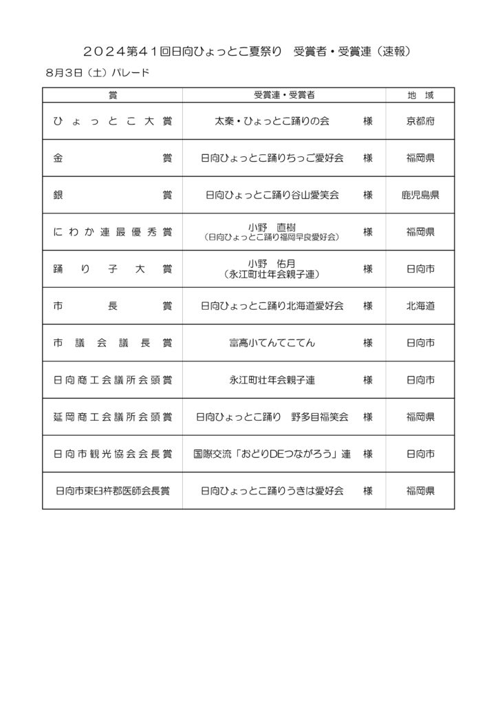 2024年08月03日 2024第41回日向ひょっとこ夏祭りパレード結果(速報) 2024年8月3日(土)に開催されました第41回日向ひょっとこ夏祭りパレードの結果速報をお知らせいたします。 受賞された皆様おめでとうございます!踊り手の皆様、また来年パレードでお会いしましょう! 第41回パレード結果 → 【PDF】